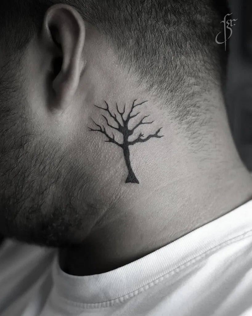 Small Blackwork Poison Tree with Apple on Women Neck Tattoo by @sunday.tattoos