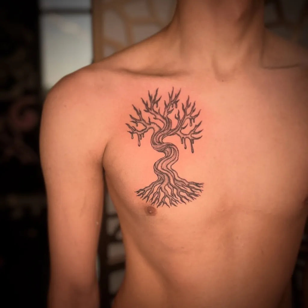 - Rib or sternum: Intimate placement with flowing roots and delicate leaves.