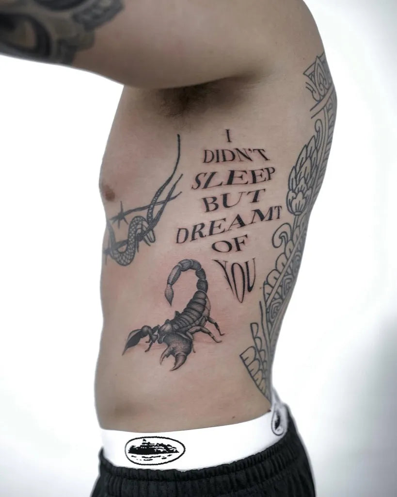 Medium Blackwork Scorpion Dream Quote Tattoo on Men Torso by @loftn5tattoo_bali