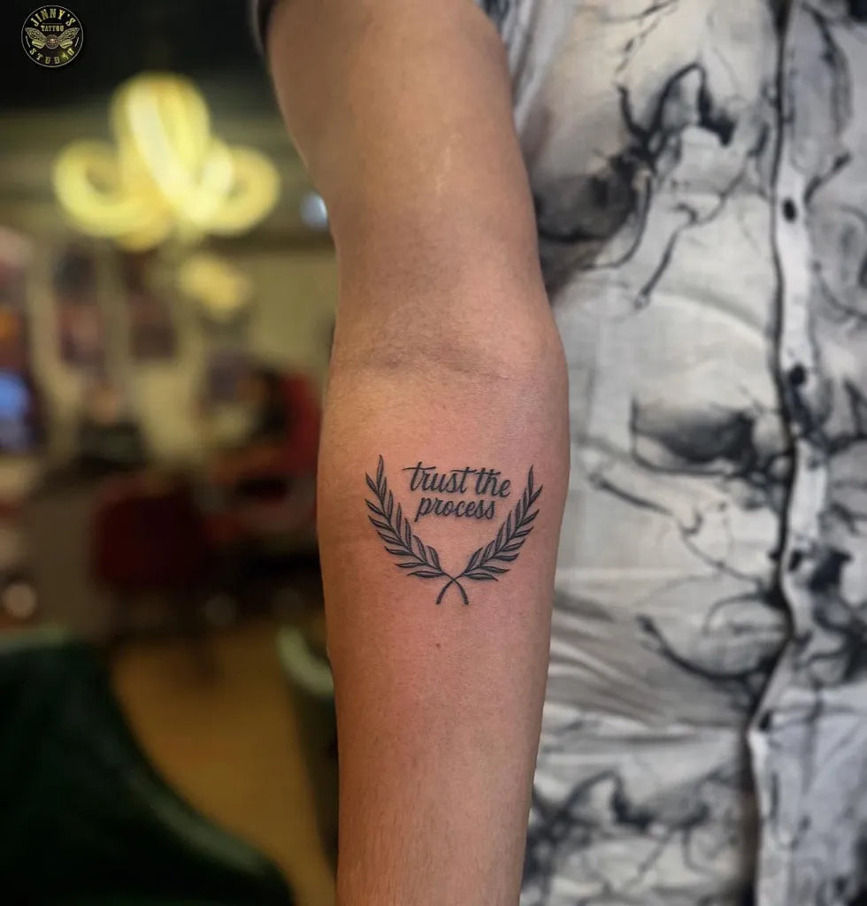 Small Blackwork Laurel Quote Tattoo on Men Arm by @jinnytattoomechanic