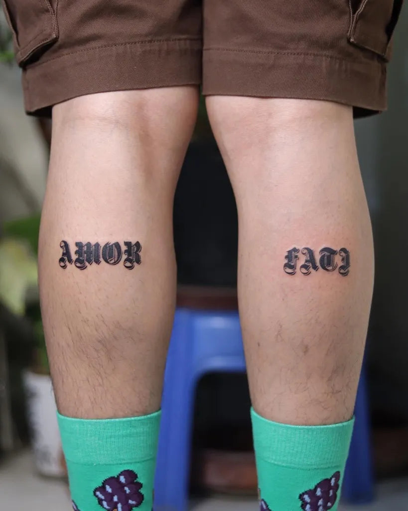 Small Blackwork Word Quote Tattoo on Men Legs by @naga_ink_master