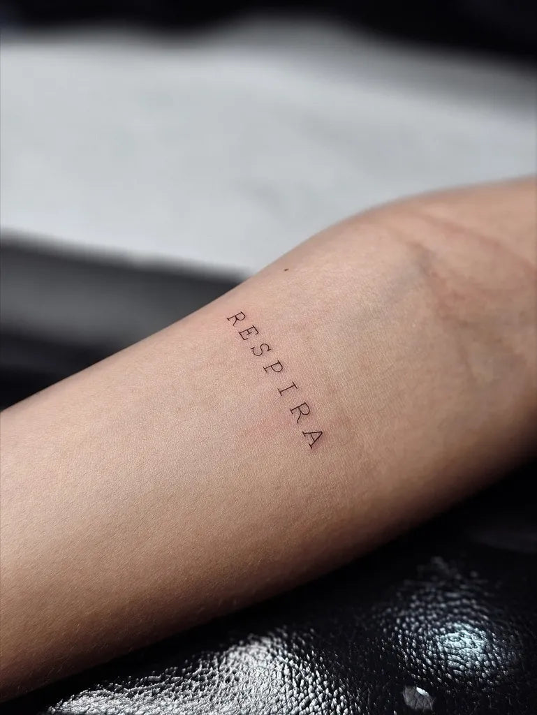 Small Fine Line Respirar Quote Tattoo on Women Forearm by @sailorstattoomilanoduomo