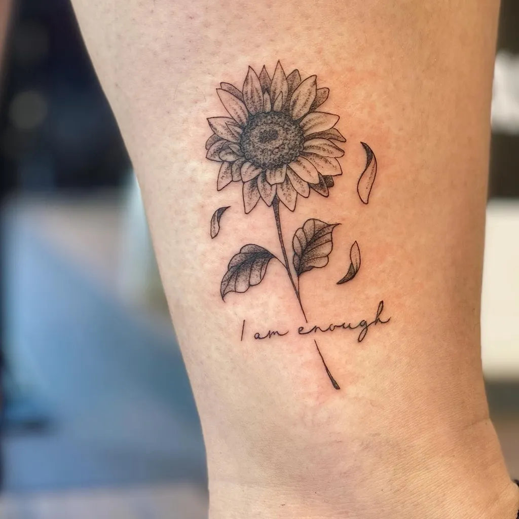 Small Fine Line Sunflower I Am Enough Tattoo on Women Ankle by @blackspadetattoo
