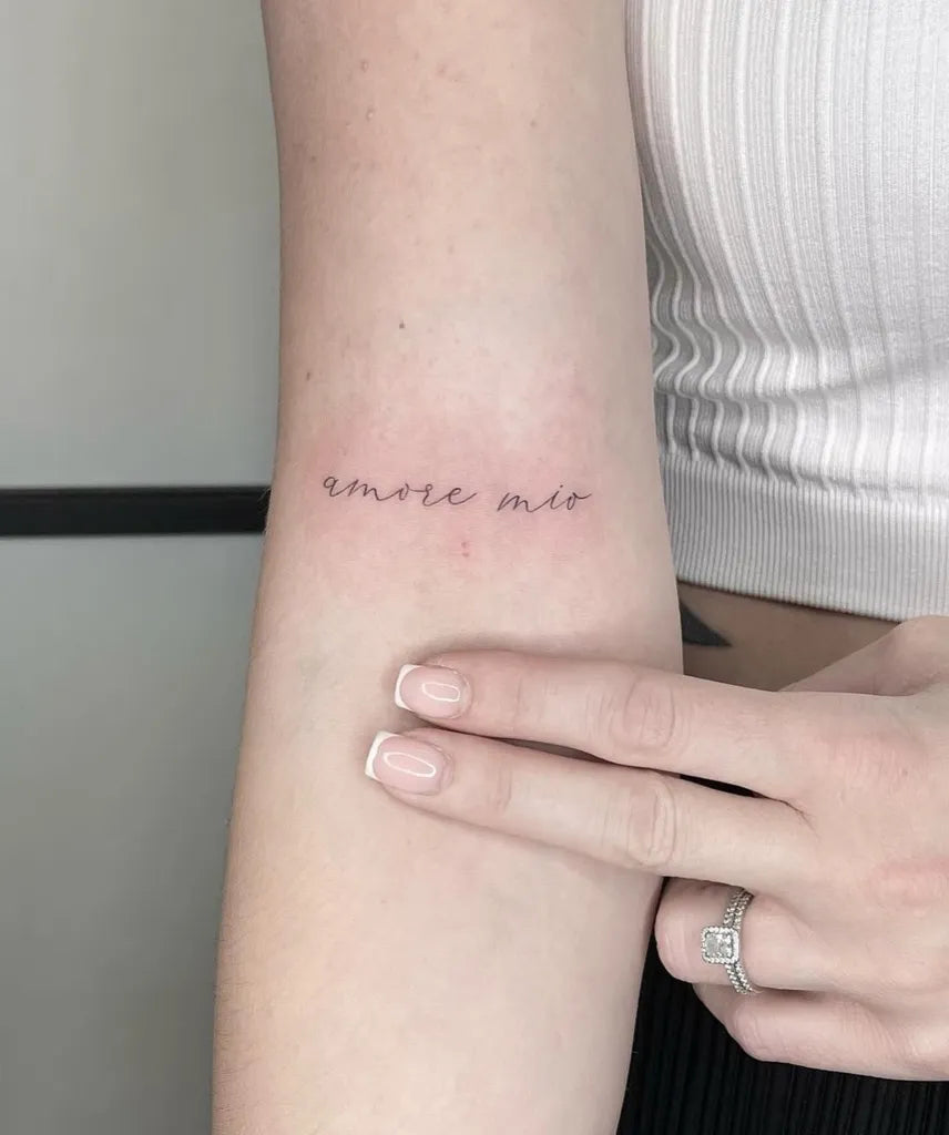 Small Fine Line Word Quote Tattoo on Women Forearm by @simple_tattoo_ideas