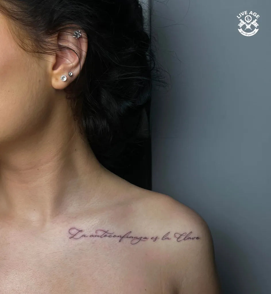 Small Fine Line Text Quote Tattoo on Women Shoulder by @liveage_sad