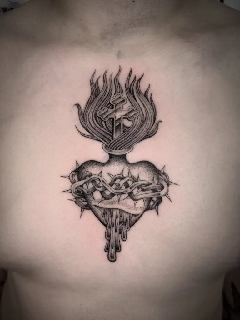 Medium Black and Grey Sacred Heart with Crown of Thorns and Flames Tattoo on Men Chest by @davidp_tattoos