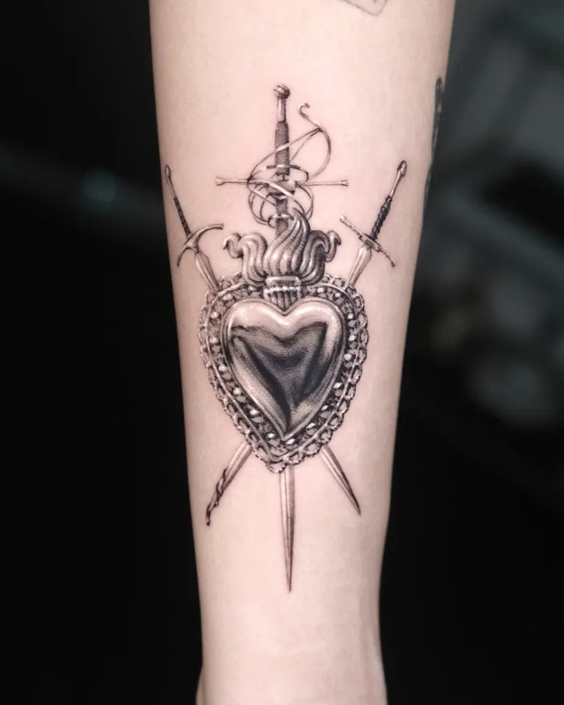 Medium Black and Grey Sacred Heart with Swords Tattoo on Women Arm by @hammersmith_tattoo_london
