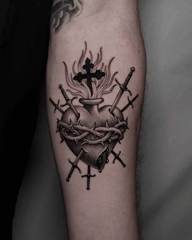 Medium Black and Grey Sacred Heart with Daggers and Flames Tattoo on Men Arm by @stevefranciosa.tattoos