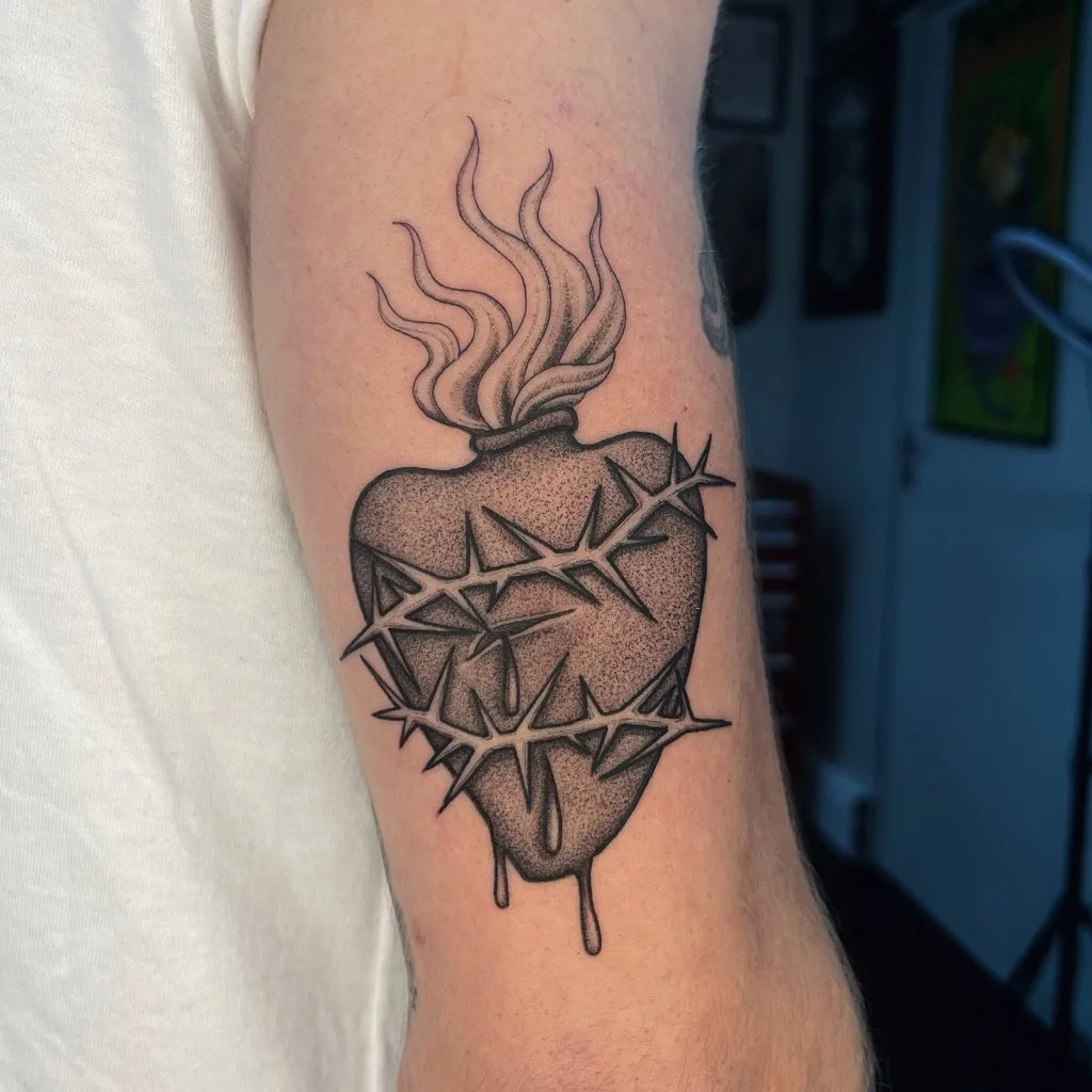 Medium Black and Grey Sacred Heart with Thorns and Flames Tattoo on Men Arm by @paige_bates_tattoos