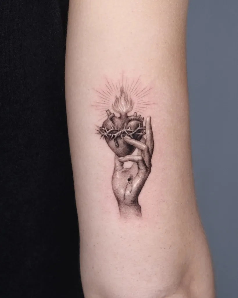 Small Black and Grey Sacred Heart with Hand Tattoo on Women Arm by @40.tatt
