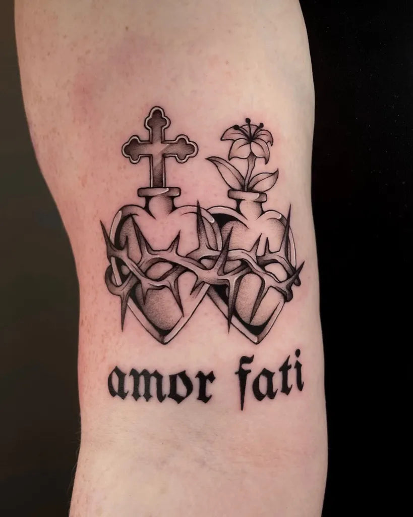 Medium Black and Grey Sacred Hearts with Cross and Lily Tattoo on Men Arm by @daeath