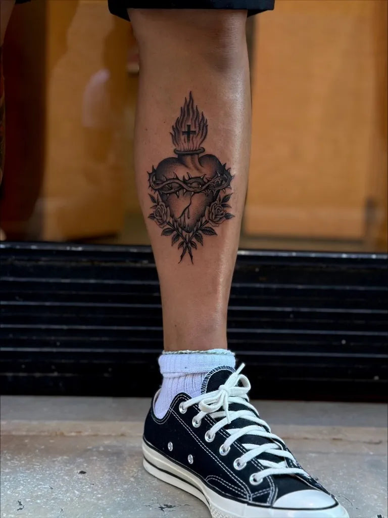 Medium Blackwork Sacred Heart Tattoo on Men Leg by @inkaddictiontattoo_vr