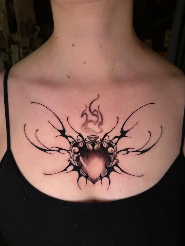 Medium Blackwork Sacred Heart Tribal Tattoo on Women Chest by @ghoul.tattoos