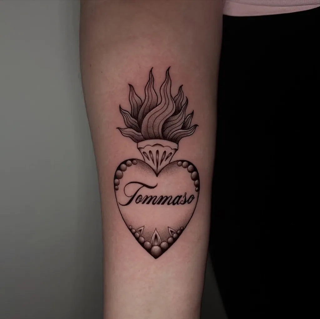 Medium Blackwork Sacred Heart with Flames and Name Tattoo on Women Arm by @eleonorghizzoni_tattoo