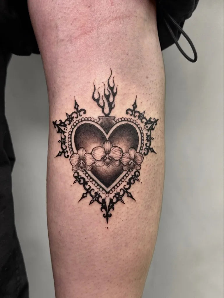 Small Black and Grey Sacred Heart with Flowers and Flames Tattoo on Women Arm by @komi.tt