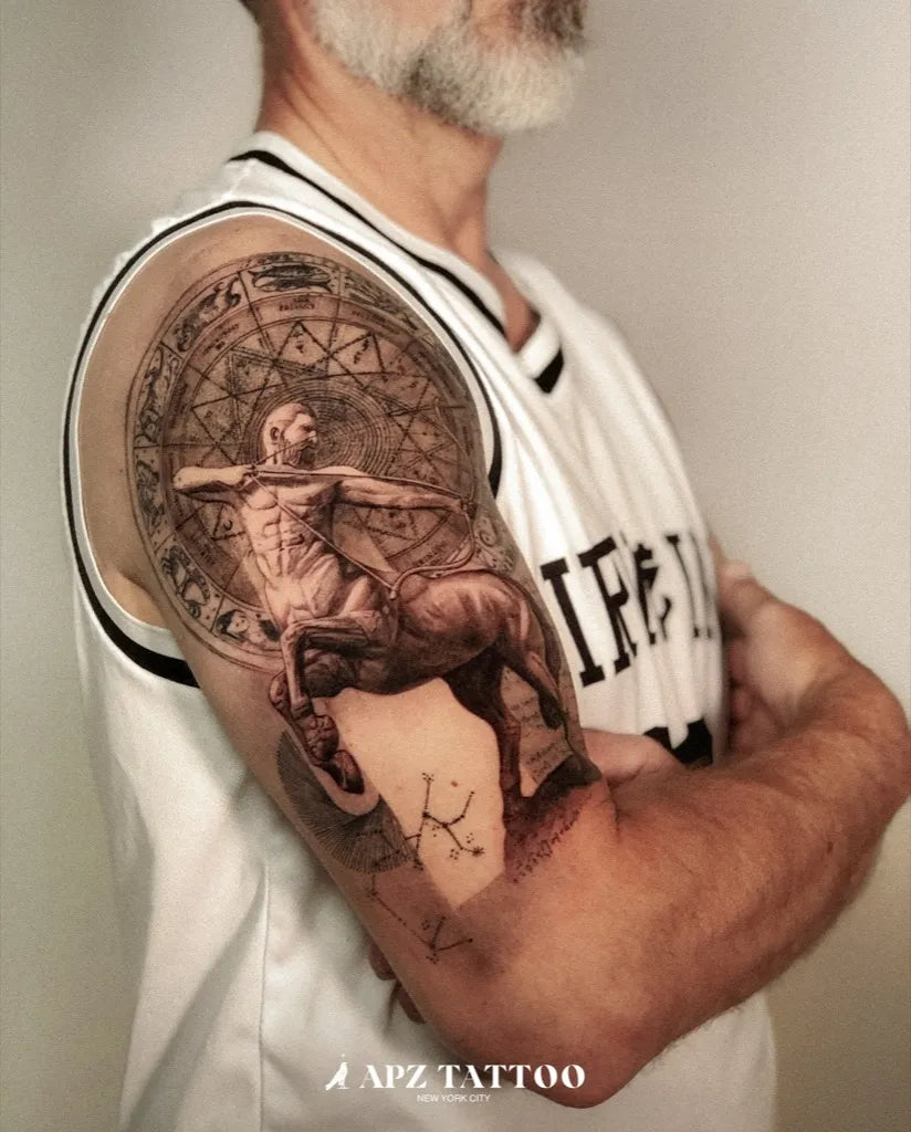 - Color strategy: Sagittarius thrives in rich jewel tones—indigo, royal blue (Jupiter), and gold accents for prosperity. Blackwork remains classic and durable.