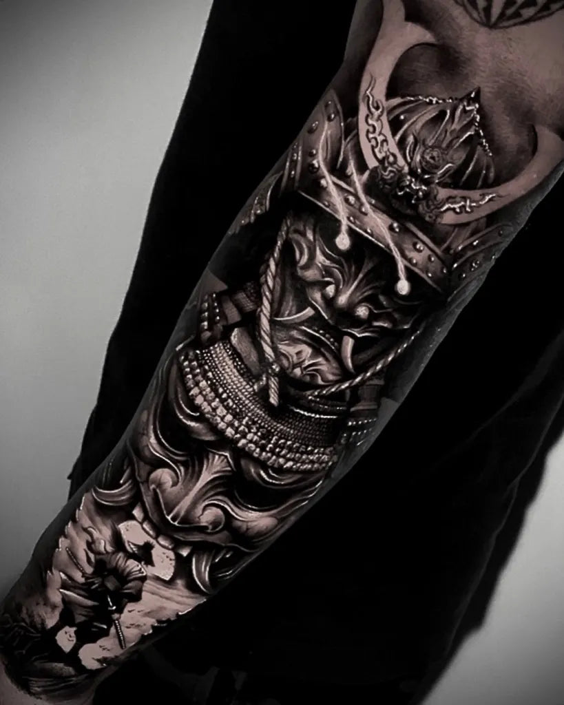Big Black and Grey Samurai Armor and Mask Tattoo on Men Arm by @rm.tattoo.roger