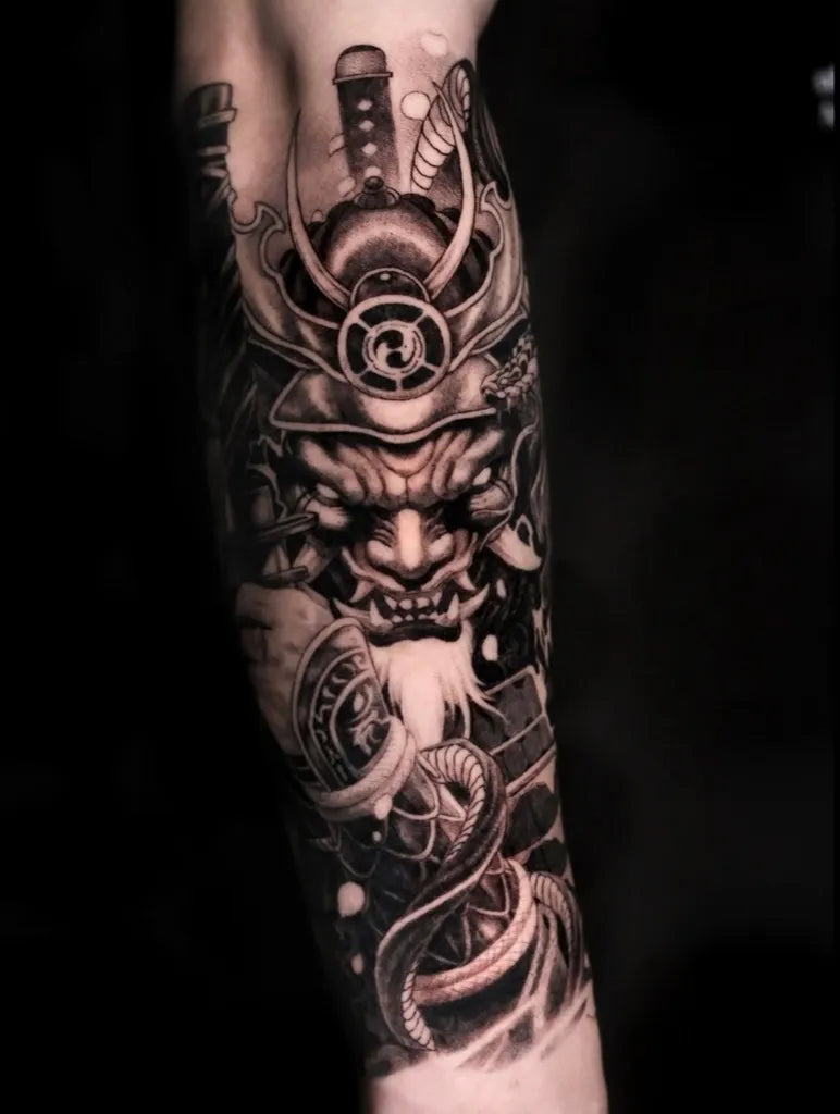Big Black and Grey Samurai Hannya Mask Dragon Tattoo on Men Arm by @luke.vella.obsidian