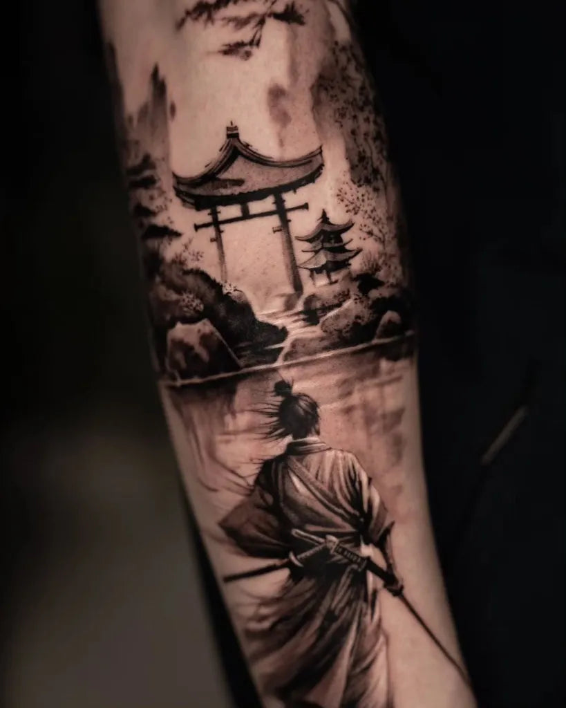 Big Black and Grey Samurai Torii Gate Tattoo on Men Arm by @fani_tattoo