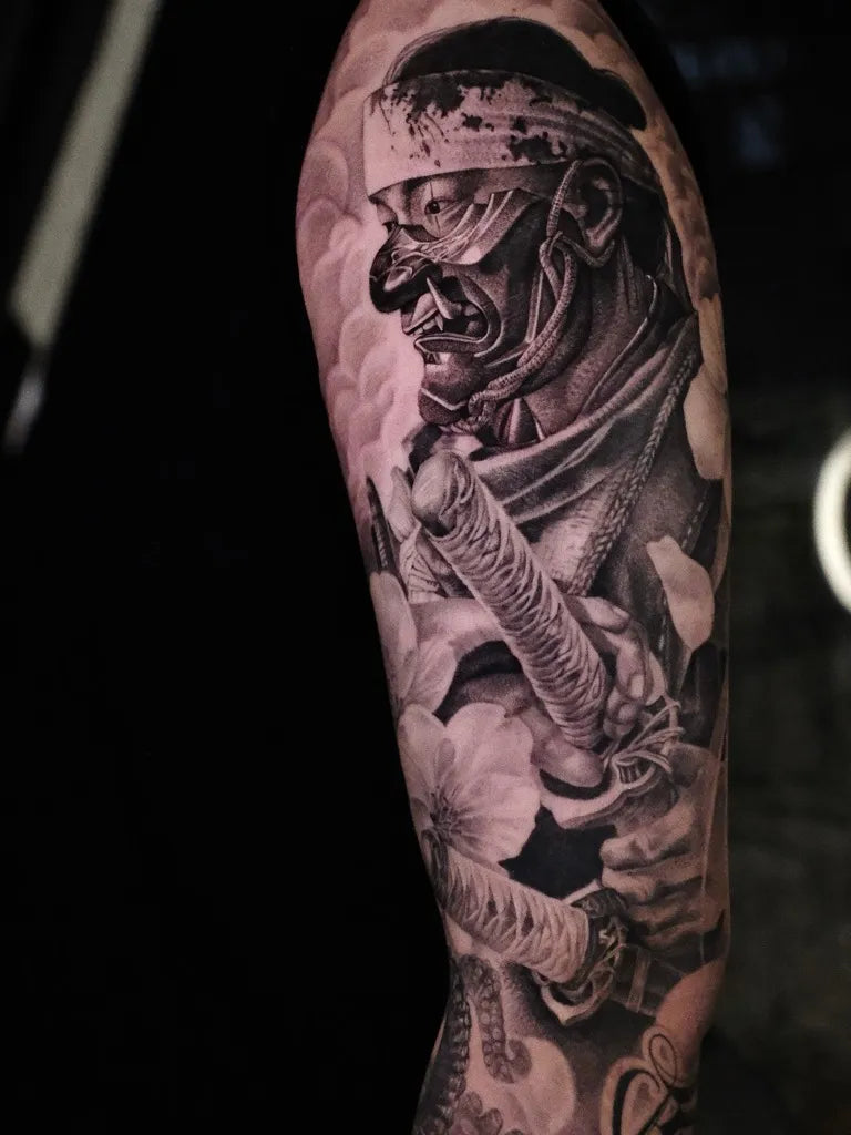 Big Black and Grey Samurai with Ghost and Flowers Tattoo on Men Arm by @tattooist_reset