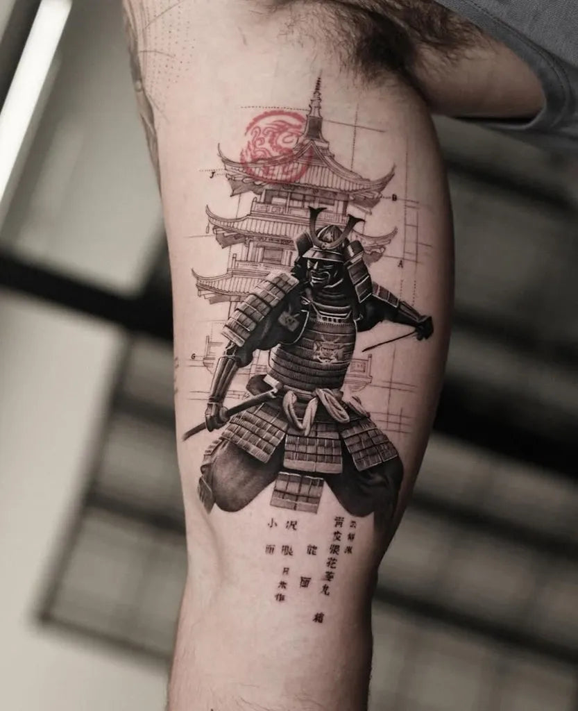 Big Black and Grey Samurai and Pagoda Tattoo on Men Arm by @kasian_tattoo