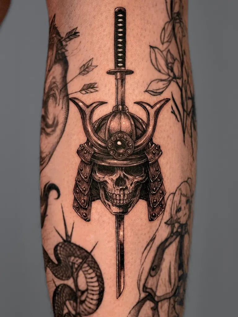 Big Blackwork Samurai Skull Helmet Sword Tattoo on Men Arm by @kabitattooer