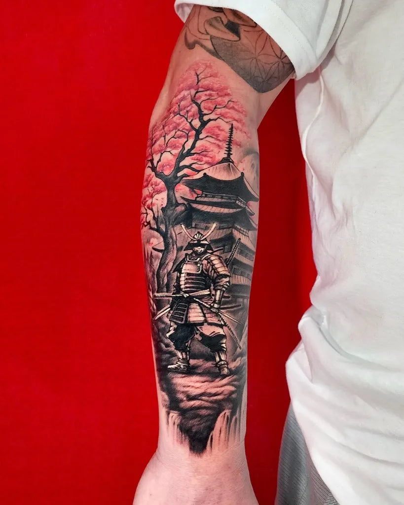 Big Black and Grey Samurai Cherry Blossom Tree Pagoda Tattoo on Men Arm by @dragoncityink.danang