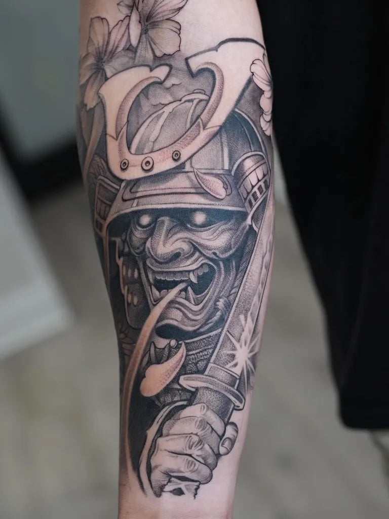 Big Black and Grey Samurai Hannya Mask with Sword Tattoo on Men Arm by @sadan_tattoo_