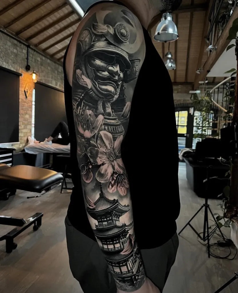 Big Black and Grey Samurai with Cherry Blossom and Pagoda Tattoo on Men Arm by @noireinkcollective