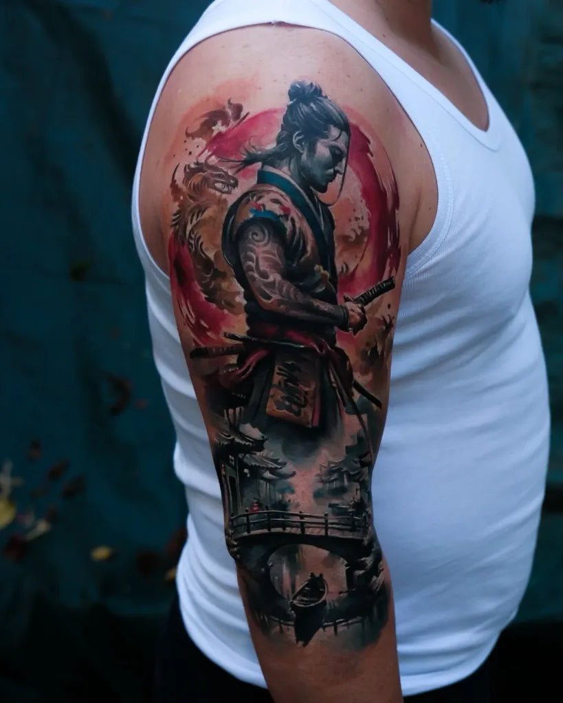 Big Irezumi Samurai with Rising Sun and Bridge Tattoo on Men Arm by @vikinkhamburg