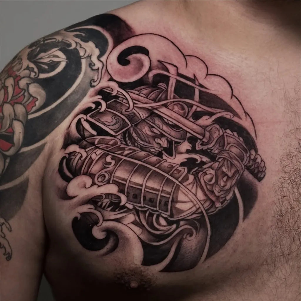 Big Irezumi Samurai with Waves and Armor Tattoo on Men Shoulder by @geisytattoo