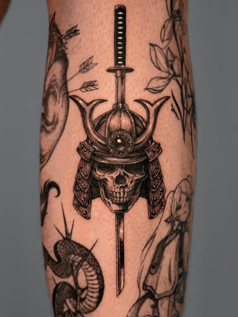 - Fine-line: Minimalist helms, katana profiles, or serene warrior busts.