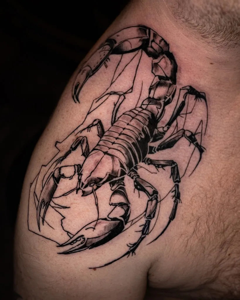 Big Blackwork Scorpion on Men Shoulder Tattoo by @rodeotattooartsinfernum