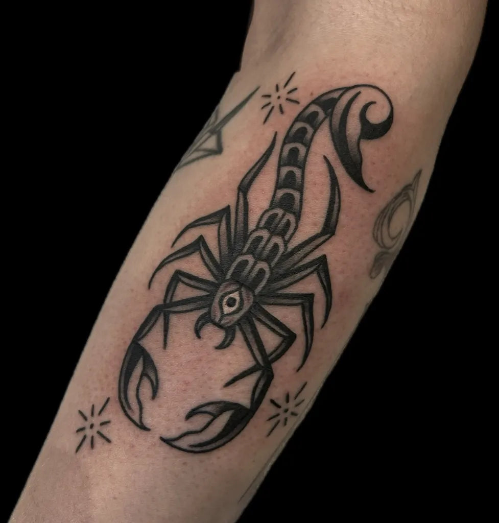 Medium Blackwork Scorpion with Stars on Women Arm Tattoo by @josh.england.tats