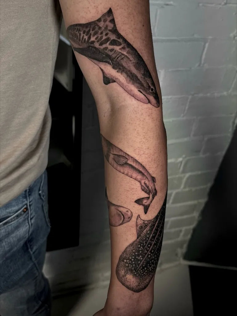 Big Black and Grey Sharks on Women Arm Tattoo by @pokeeeeeeeoh