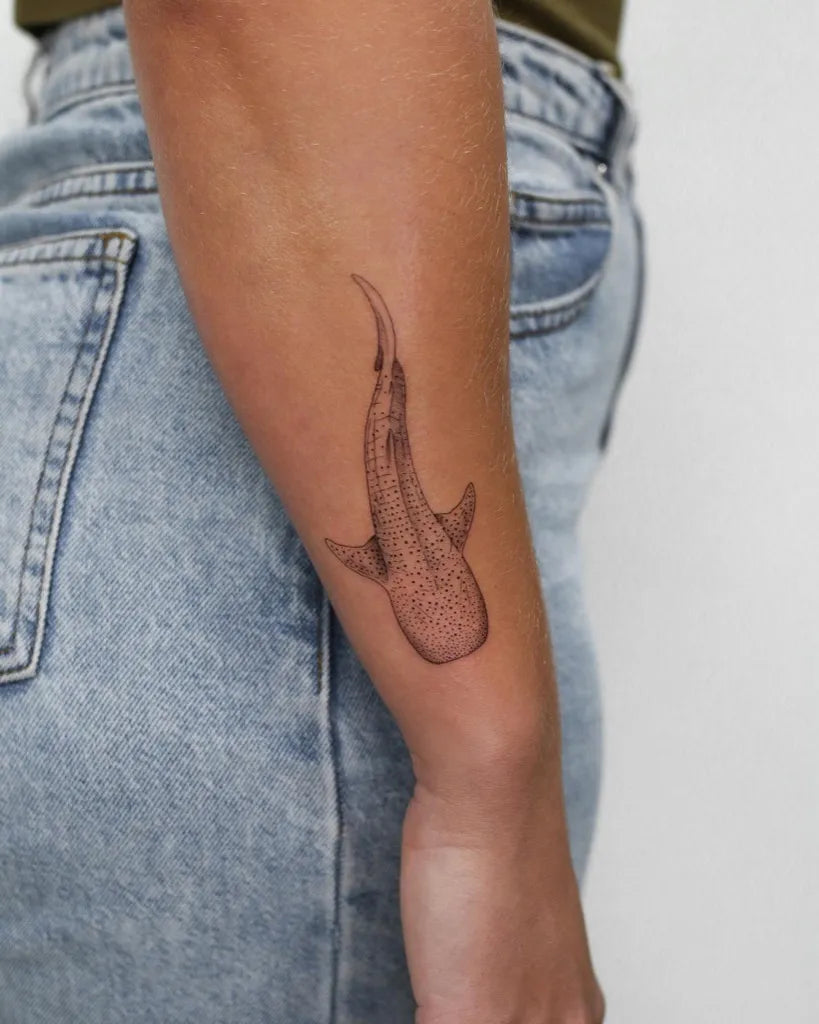 Small Blackwork Whale Shark with Stars on Women Arm Tattoo by @tattoop.art