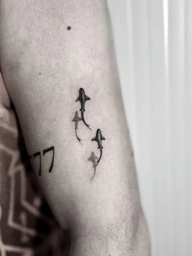 Small Blackwork Sharks on Men Arm Tattoo by @ink_cze