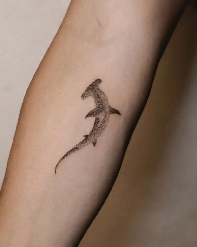 Small Dotwork Hammerhead Shark on Women Arm Tattoo by @bless_dot