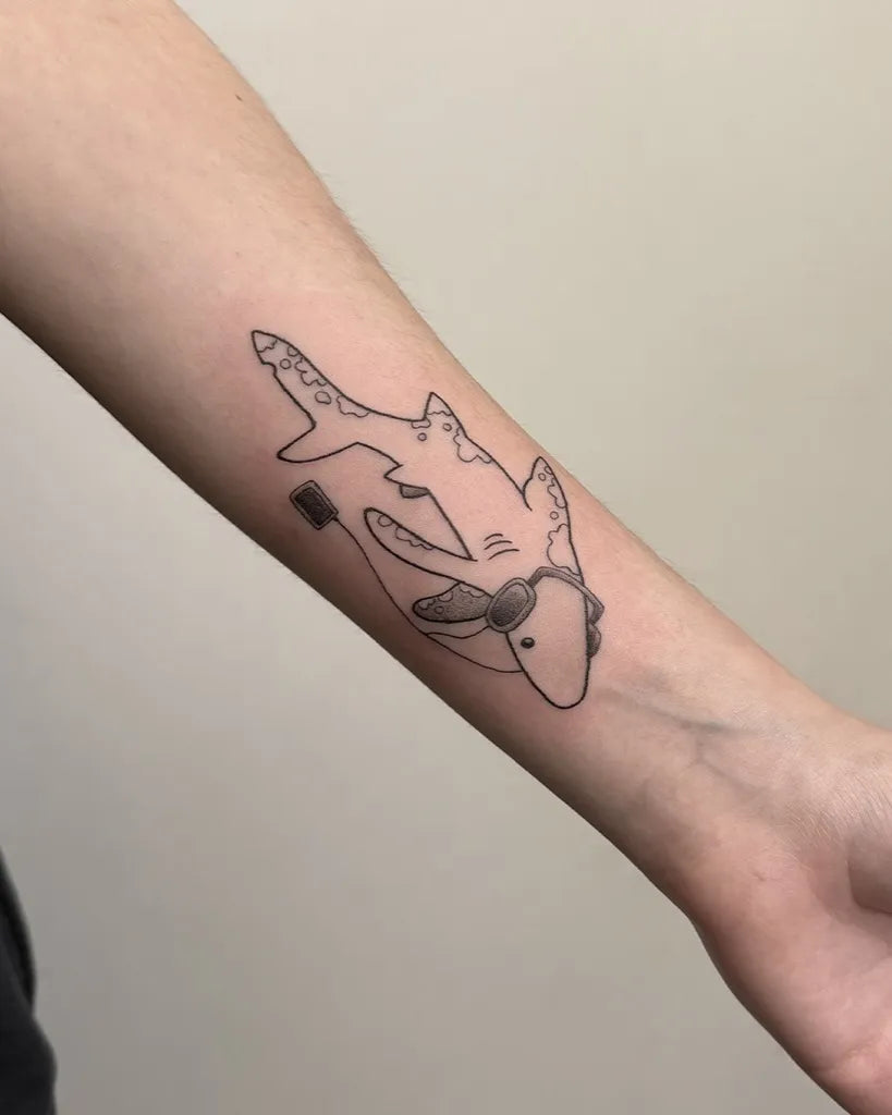 Small Linework Great White Shark with Sunglasses on Men Arm Tattoo by @pulsar.tattoo
