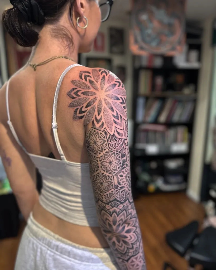 Big Mandala Women Shoulder Sleeve Tattoo by @joekintztattooing