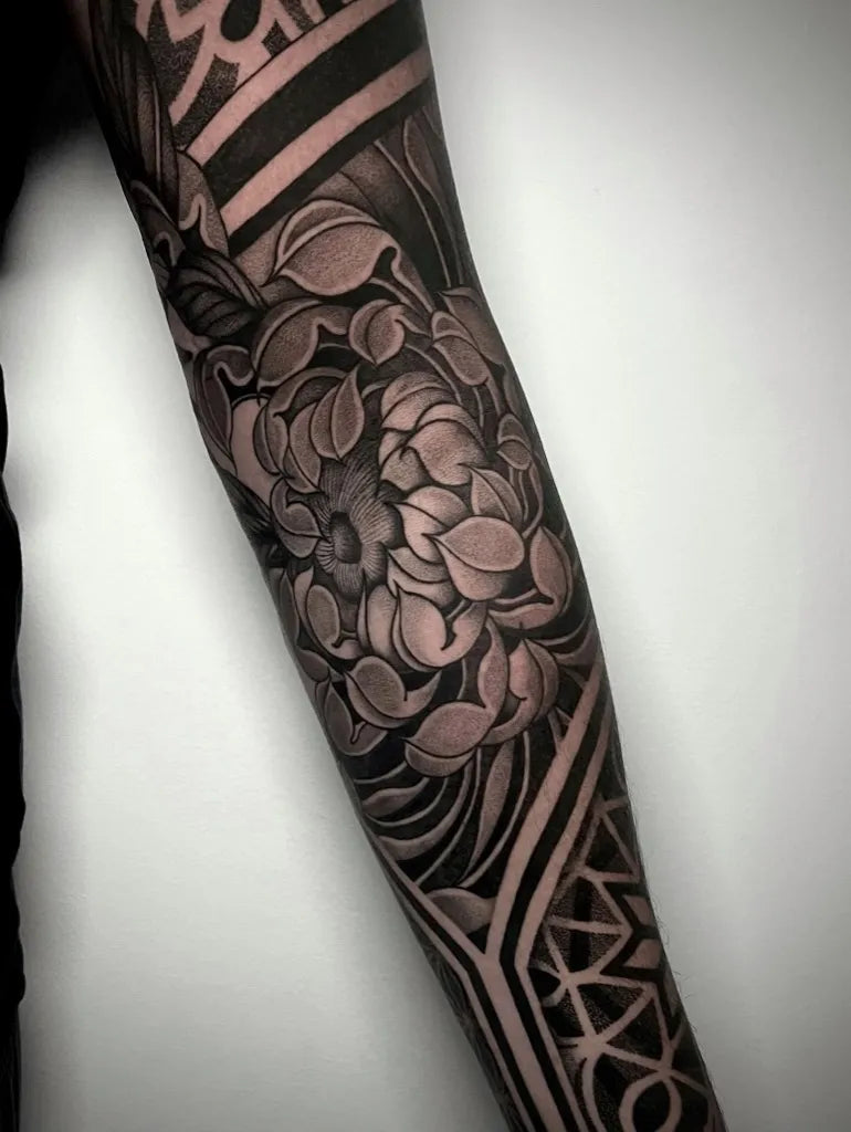 Big Neo Traditional Chrysanthemum and Geometric Men Arm Sleeve Tattoo by @t.inking