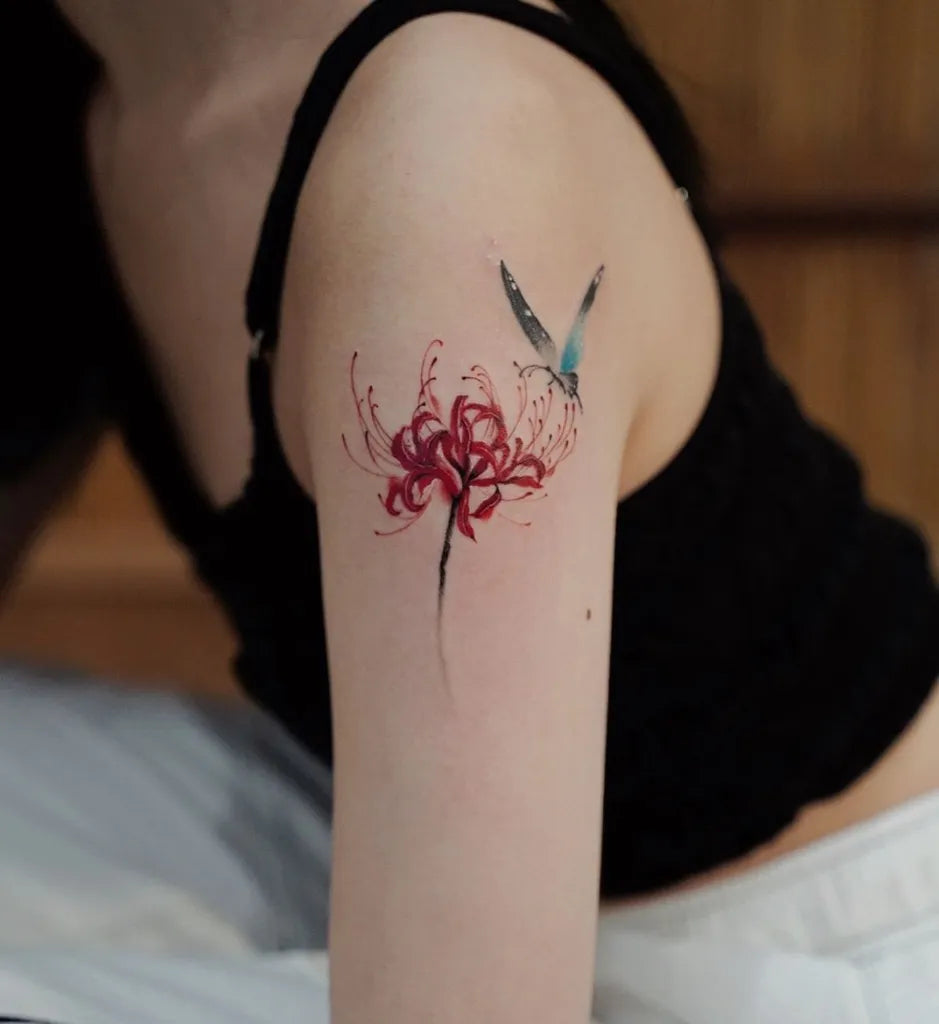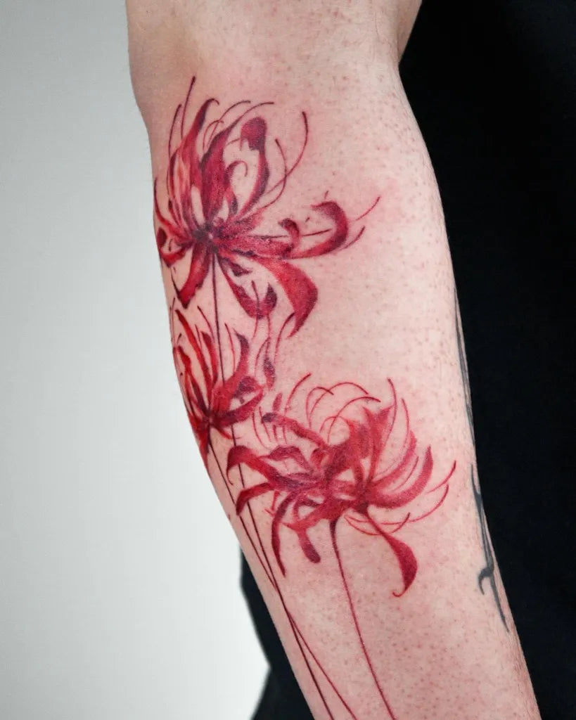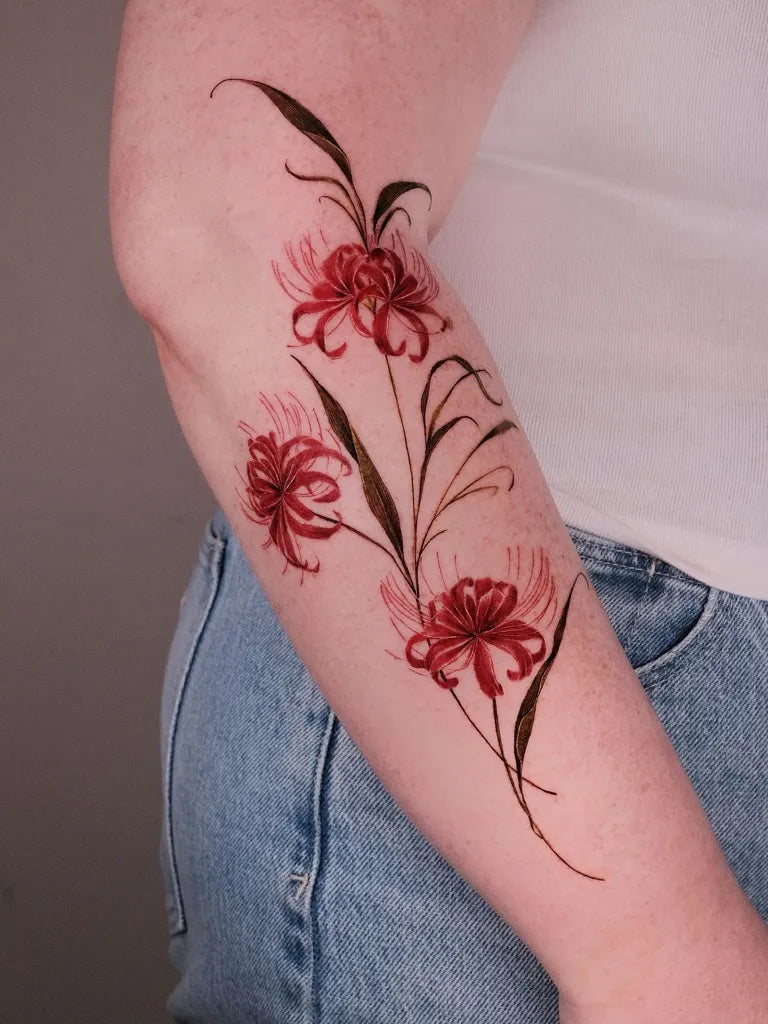 - For color, anchor reds with rich outlines or cool shadows so the spider lily tattoo maintains contrast over time.