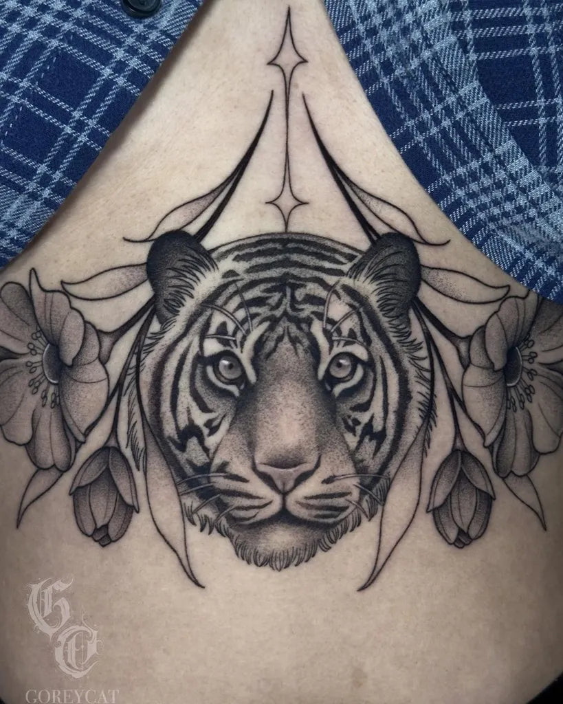 Big Blackwork Tiger and Hibiscus on Women Sternum Tattoo by @goreycat