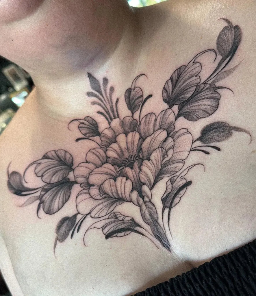 Big Floral Peony with Leaves on Women Sternum Tattoo by @emi1yelizabeth