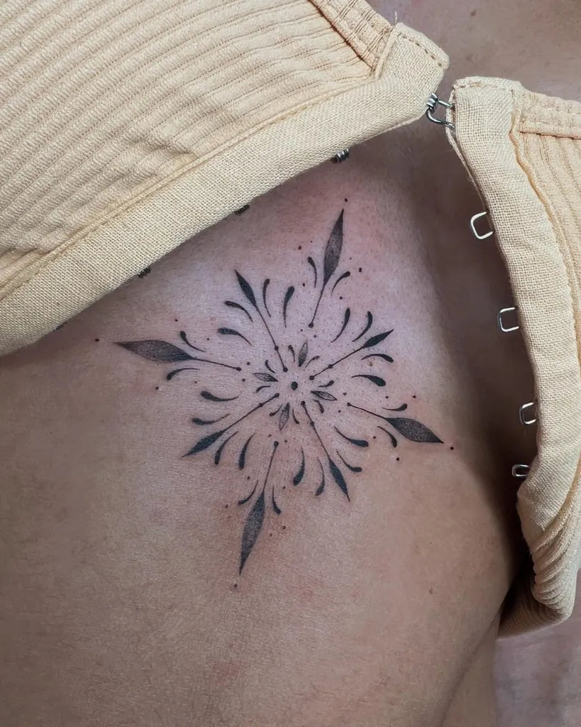 Small Blackwork Floral Star on Women Sternum Tattoo by @mikel_ink_