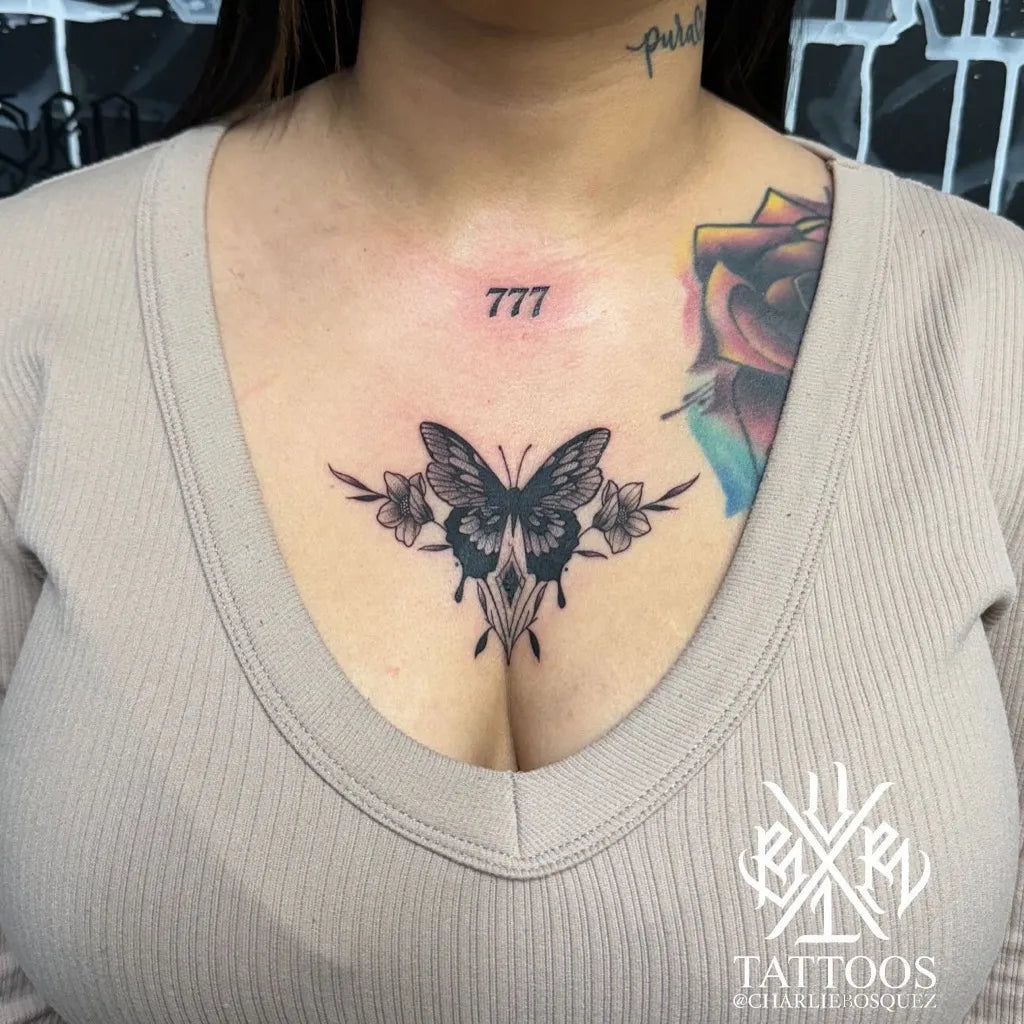 Small Fine Line Butterfly Flowers 777 on Women Sternum Tattoo by @charliebosquez