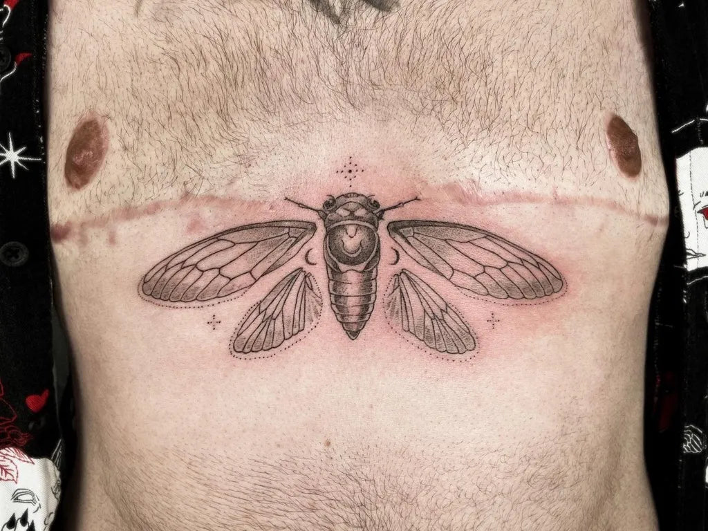 Small Linework Cicada on Men Sternum Tattoo by @jarhn_tattoos
