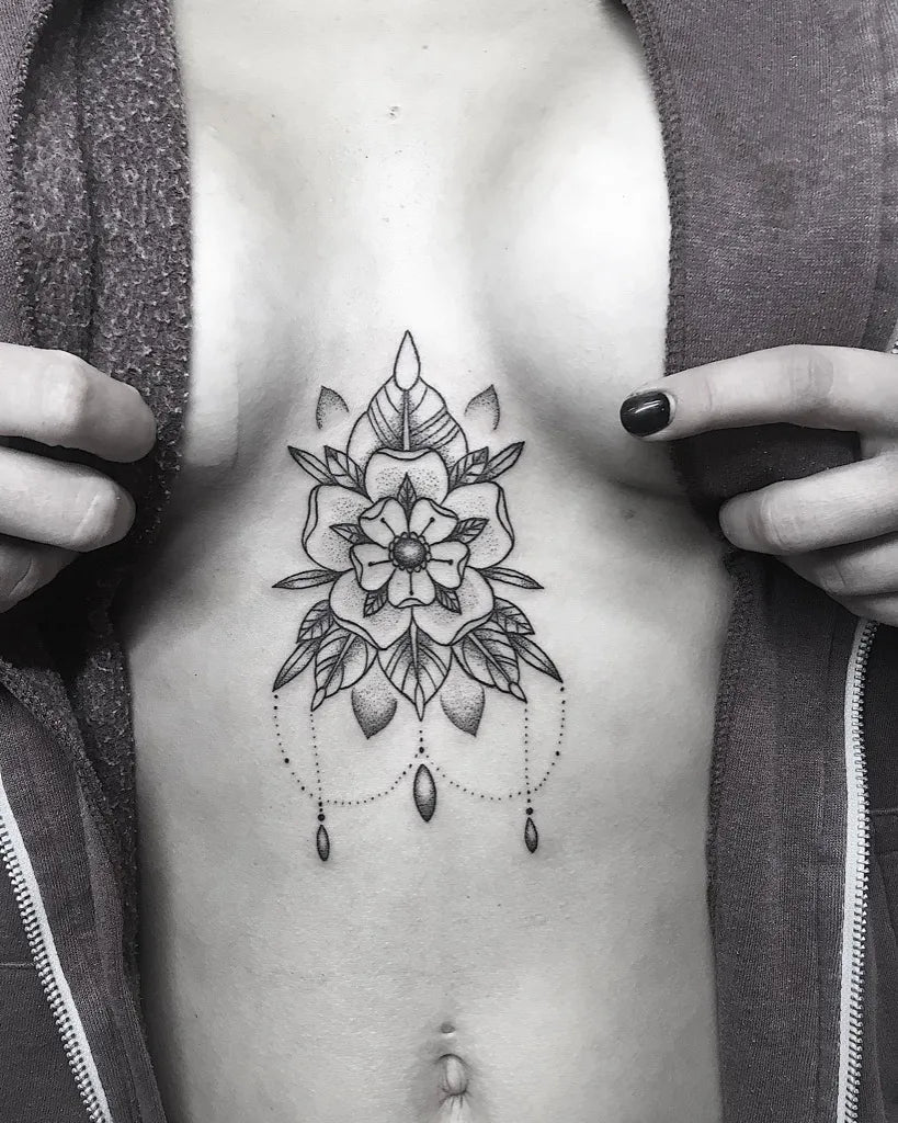 Small Floral Mandala on Women Sternum Tattoo by @trueink_tattoos