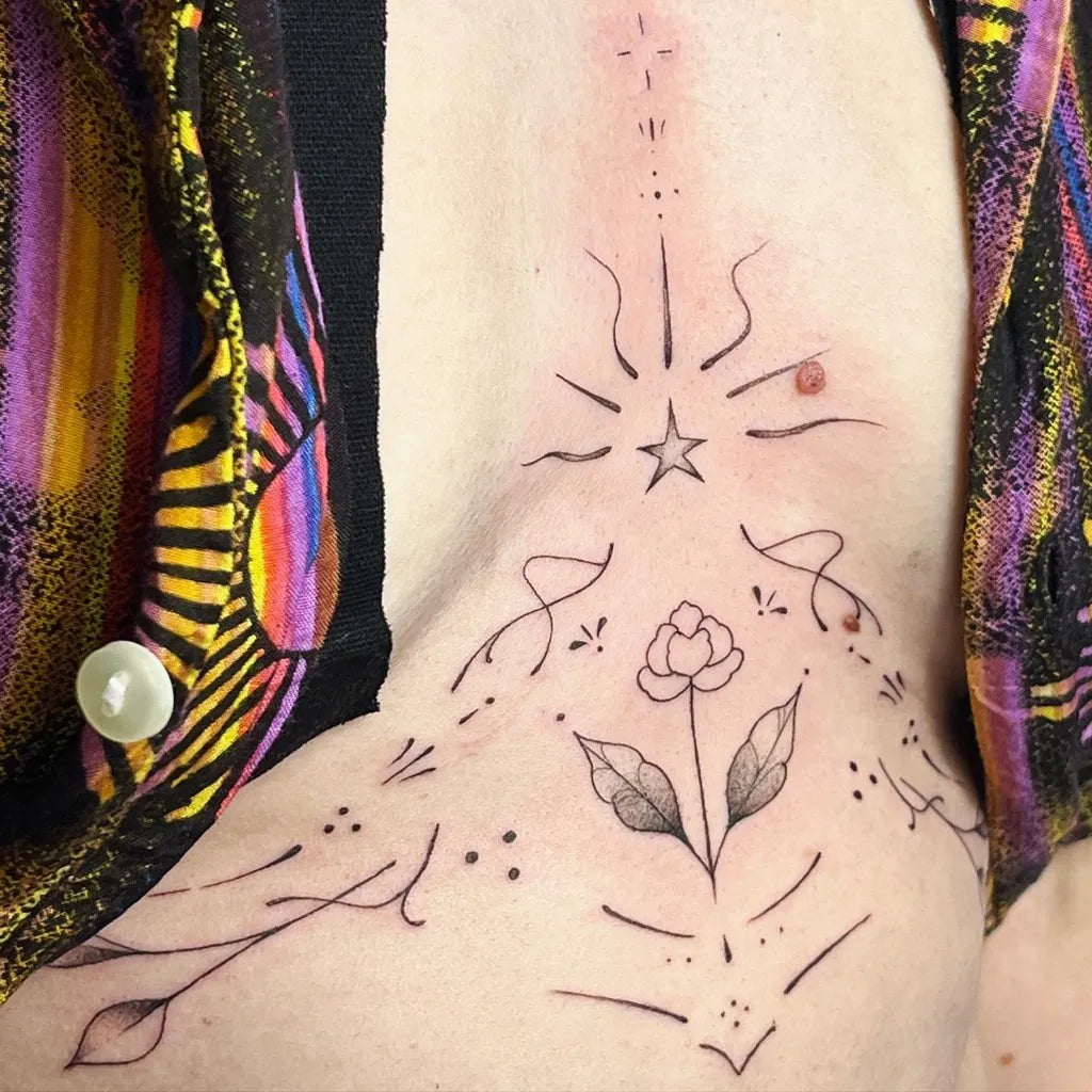 Small Minimalist Star Flower on Women Sternum Tattoo by @raebrooksartistry