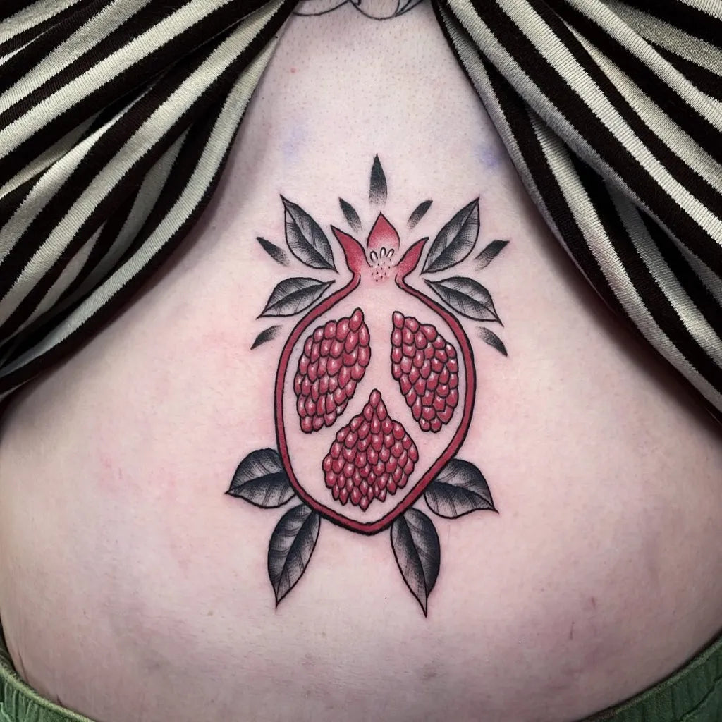 Small Neotraditional Pomegranate on Women Sternum Tattoo by @lauren.dtattoos